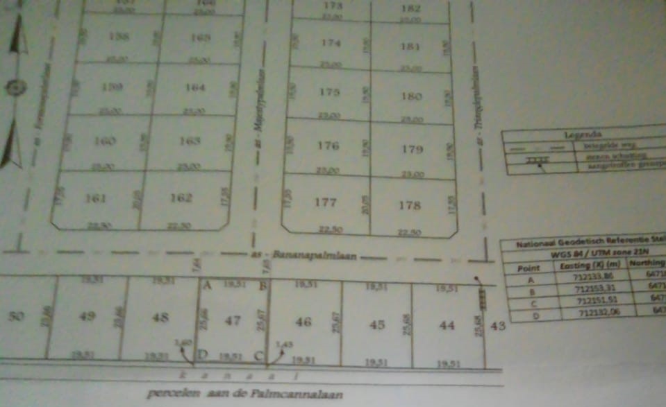 Perceel in een verharde straat op een gesloten project even voorbij Palm Village. Het terrein is 500 m² groot met een frontbreedte van 19 m en een diepte van 25 m. De straat is voorzien van waterleiding, elektravoorziening, straatverlichting en gesloten riolering.